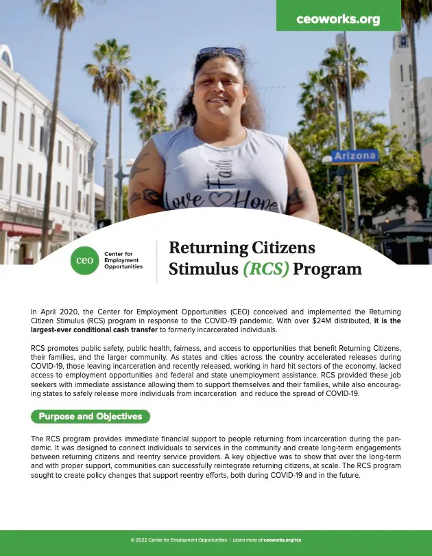 In April 2020, the Center for Employment Opportunities (CEO) conceived and implemented the Returning Citizens Stimulus (RCS) program in response to the COVID-19 pandemic. With over $24M distributed, it is the largest-ever conditional cash transfer to formerly incarcerated individuals.